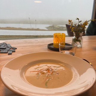 Det var tid for middag og me fekk eit koselig bord i spisesalen, det var fyr i peisen og folk kosa seg i hyggeleg lag🔥. På menyen stod det fiskasuppa til forrett, svinasteik til hovedrett og avslutta med sjokoladefondant🍴. Eg sa til den hyggelige servitøren at eg egentlig ikkje ete fisk(kvit fisk), men han sa at denna fiskasuppa laga av sjølvfiska fjellaure måtte eg berre smaka! Ok, eg fulgte anbefalingen hans og han hadde heilt rett, den var heilt nydeleg🤩👌🏽 Svinasteiken var intet unntak, kjempe gode smakar, det var frå villgrisane til eine eigaren, Geirmund. Kveldens måltid blei avslutta med ein lun sjokoladefondant, rennande i midten, akkurat slik den skal vera👌🏽 Ein skjønnar at dei har gode råvarer og ein god kokk når ein får servert eit så godt måltid🤩! Atmosfæren var heilt topp, og eg ser det hyggelig for andre òg å vera gjest her! Geirmund satt seg ned å slo av ein prat med alle gjestane. Detta er noko eg setter pris på og ser at andre gjestar føler seg heima her🥰 Mette og gode la me oss og sov godt gjennom natta. Sjølv om rommet vendte ut mot veien, var det godt isolert så me høyrte ikkje noko støy.